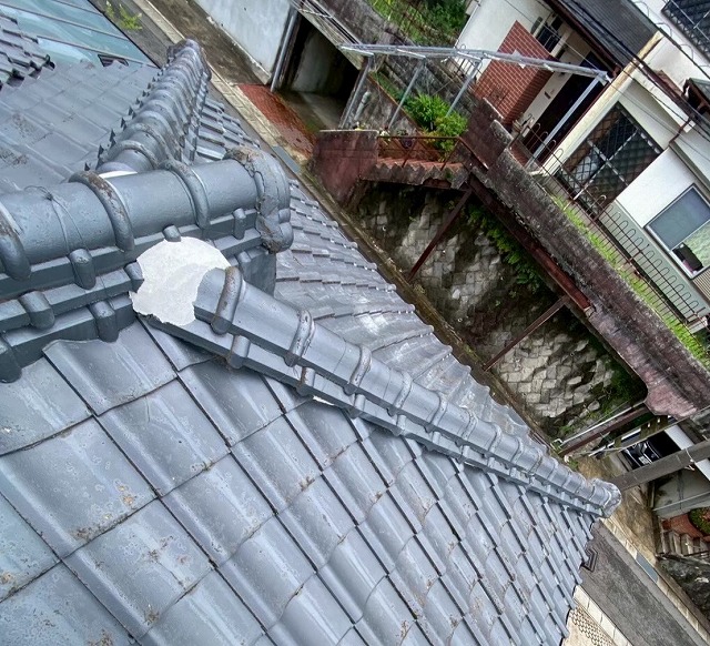 大村市で築75年の瓦屋根から雨漏りのご相談 大村市にお住まいのお客様より「天井から雨漏りしている」とのご連絡をいただき、現地調査に伺いました。建物は築約75年の木造住宅で、屋根は土葺き工法によるいぶし瓦葺き屋根になります! 雨漏りしている室内を見たところ、室内では、天井板に大きな…