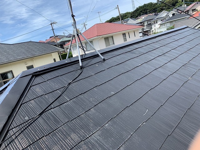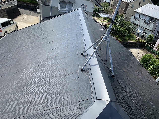 諫早市にて屋根の無料点検のご依頼をいただき現地調査に伺いました!築40年のお住まいで、屋根材はコロニアル屋根になります。コロニアルとは、スレート系の屋根材で薄くて軽いのが特徴の屋根材です。現在の住宅でも多く使用されている屋根材ですが、築年数が経つと棟板金の釘緩みなどが起こるケース…