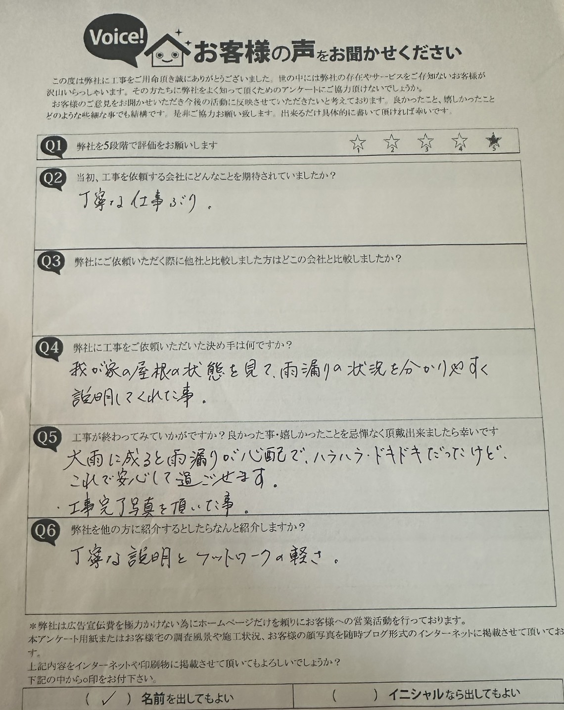 - 大雨になると、雨漏りが心配でハラハラドキドキだったけど、これで安心して過ごすことができます。