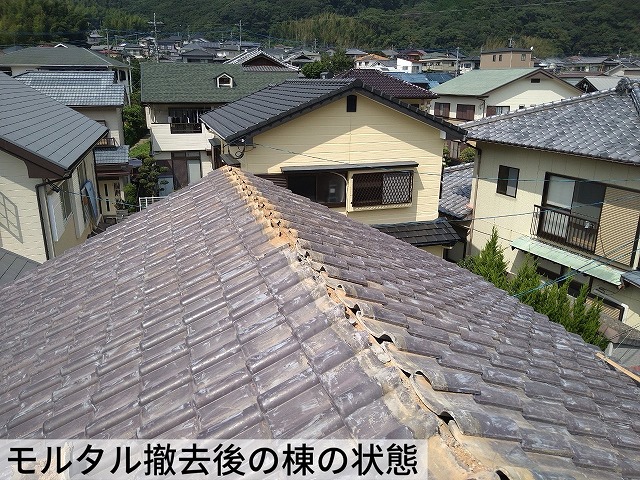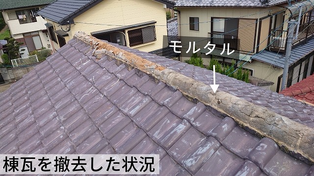 屋根点検を行うと棟瓦に歪みが見られ、棟部分のモルタル劣化も確認されました。